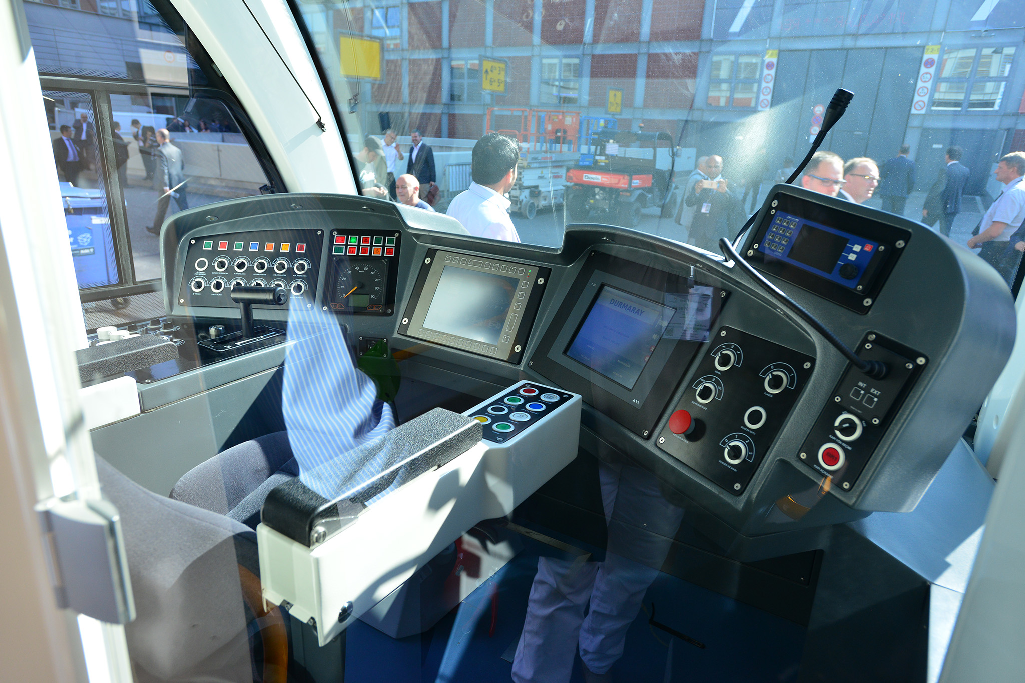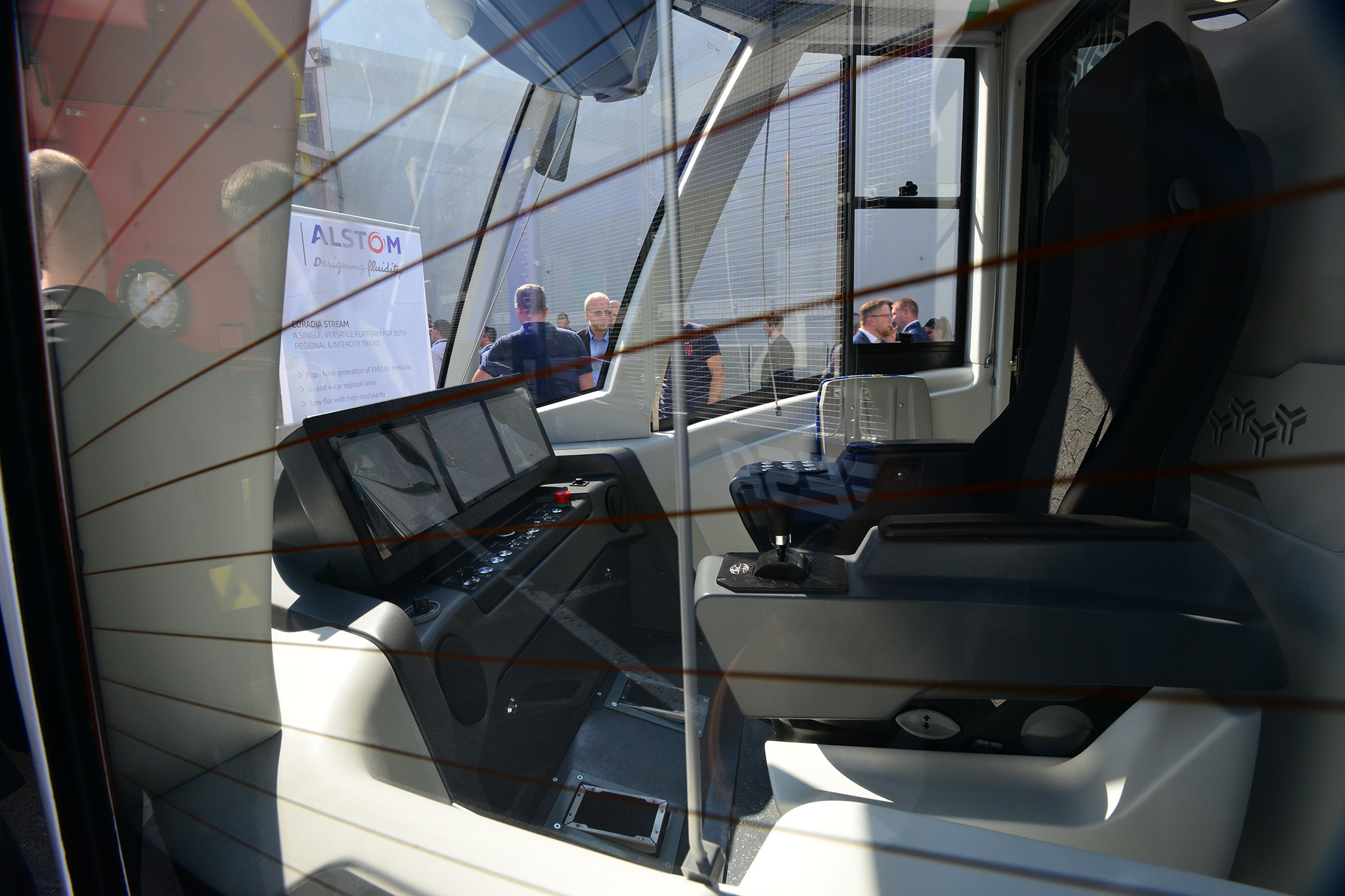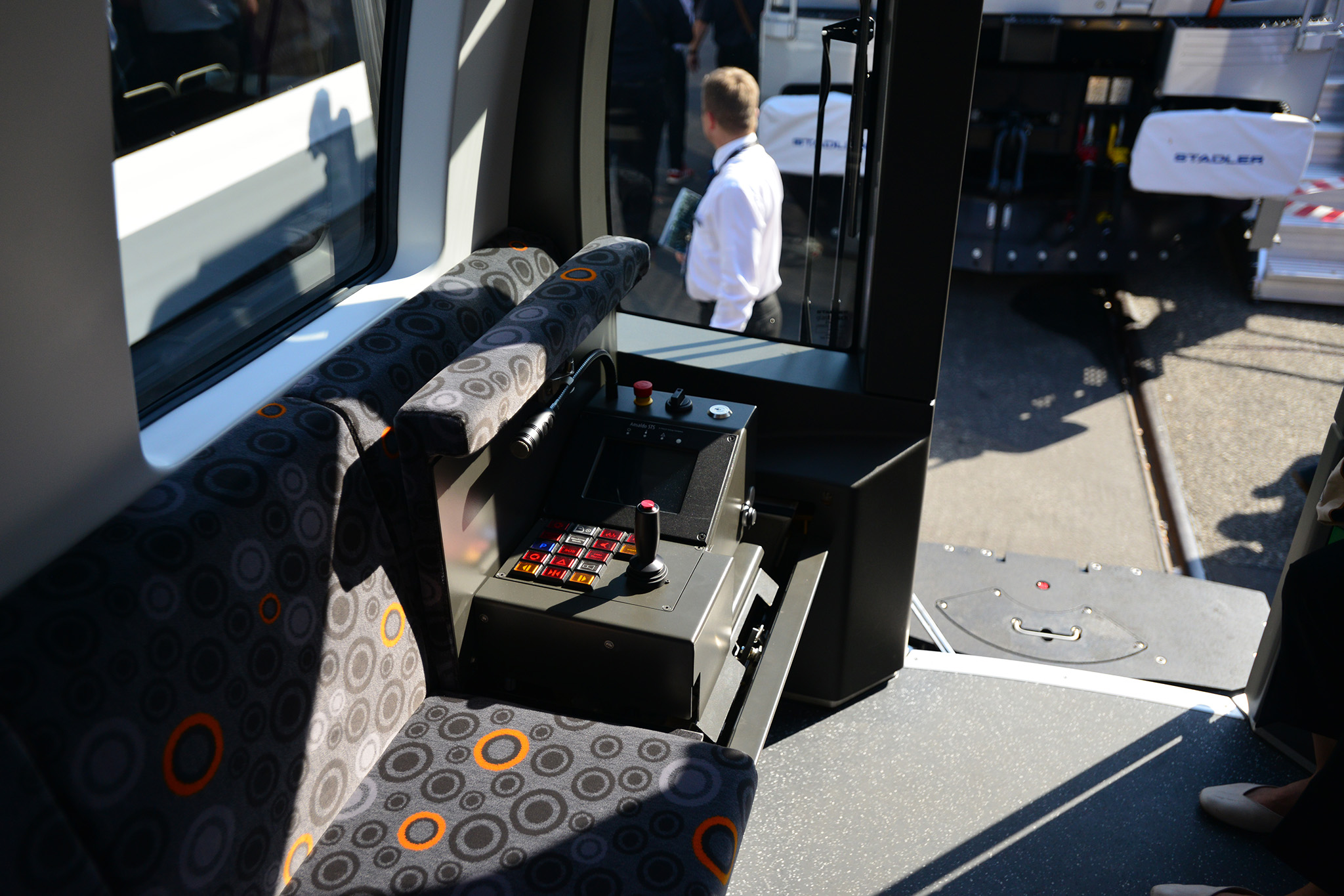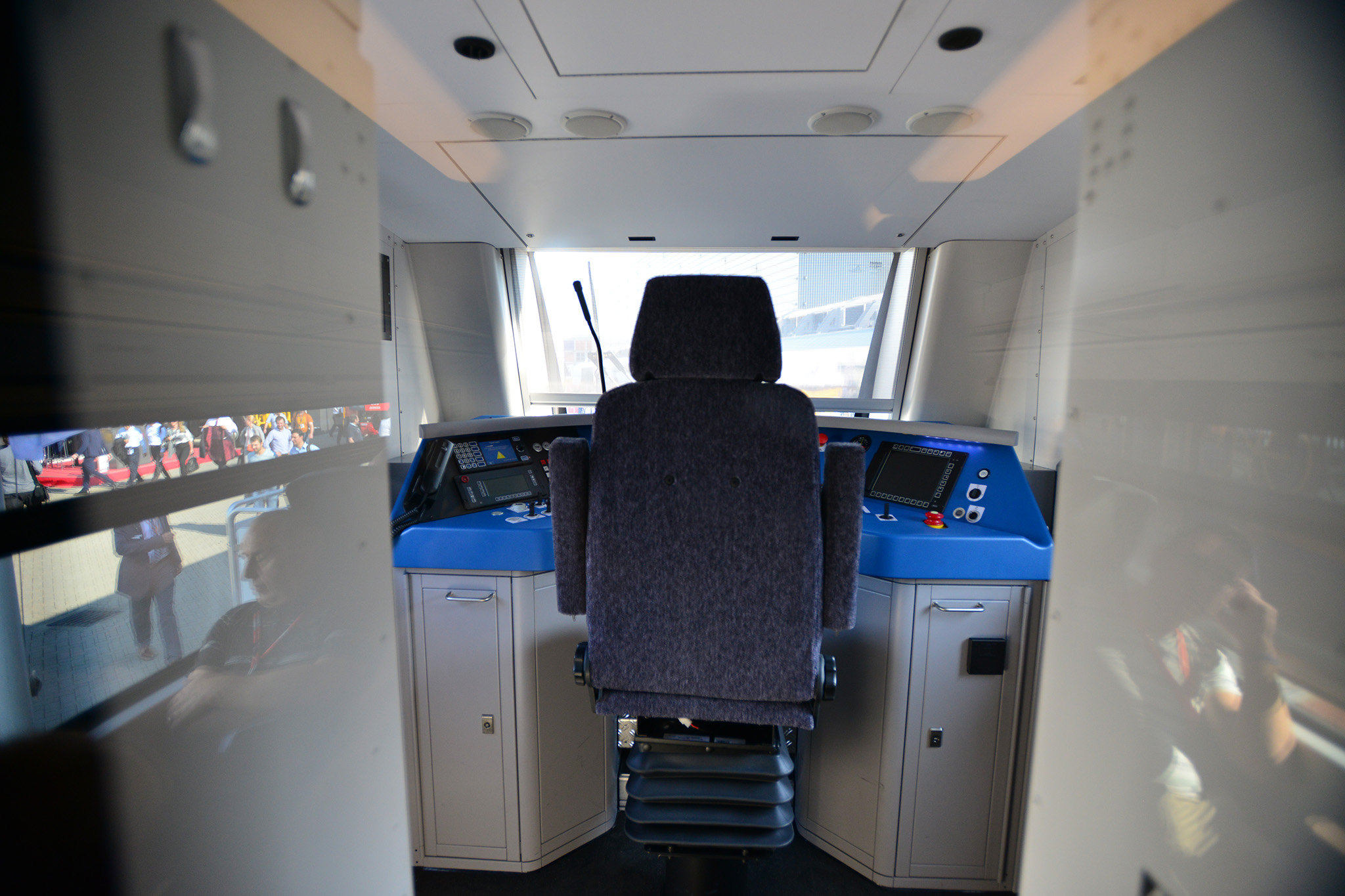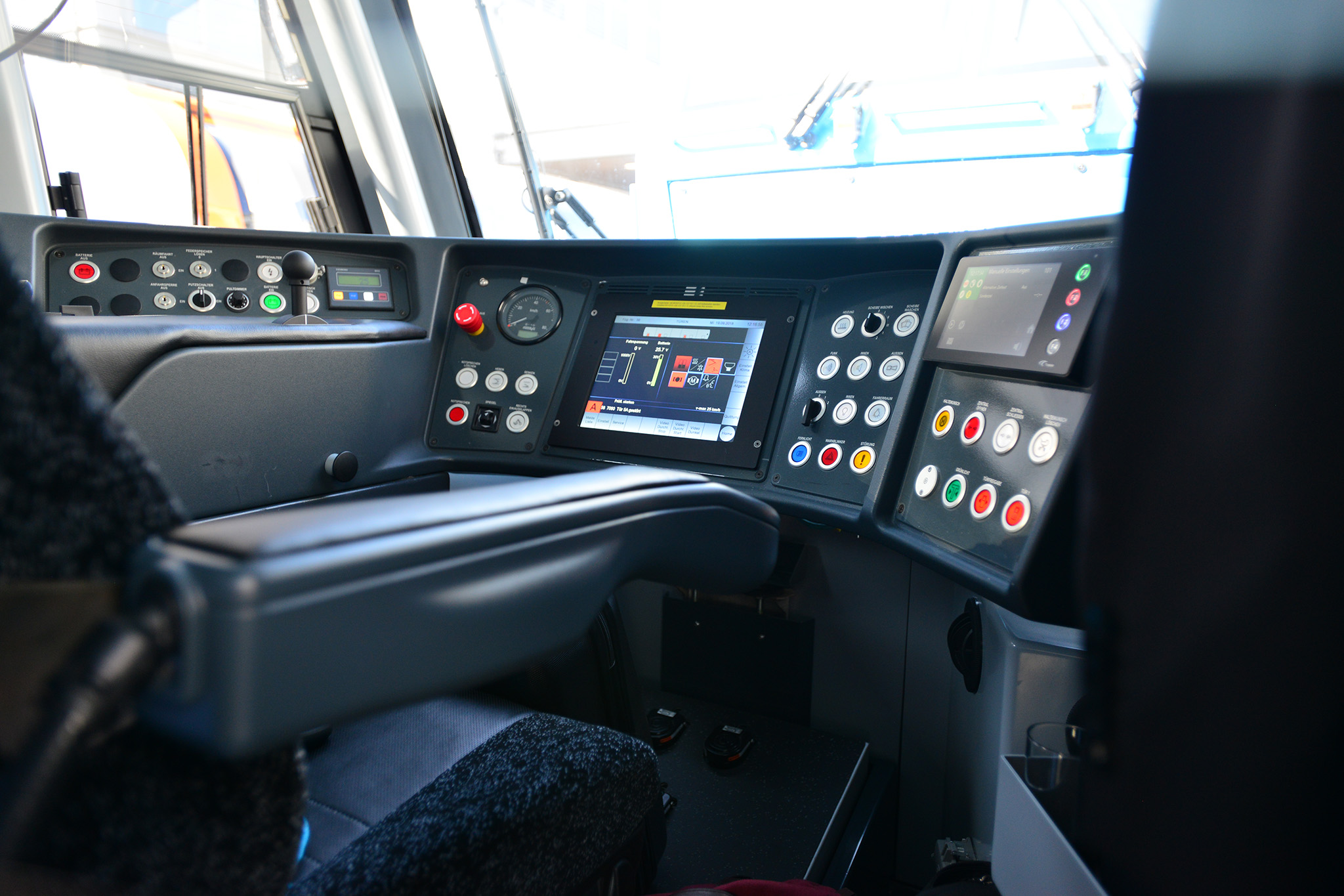 駕駛艙的設計中間一個主螢幕,右邊輔助螢幕,左邊還有一個錶式速度計。牽引和煞車整合在左側把手上,用意可能是讓駕駛左手可以操控列車動力,空出來的右手可以點觸控螢幕及相關開關控制吧!