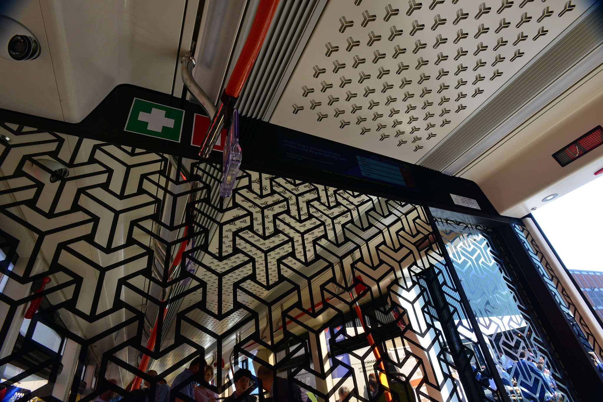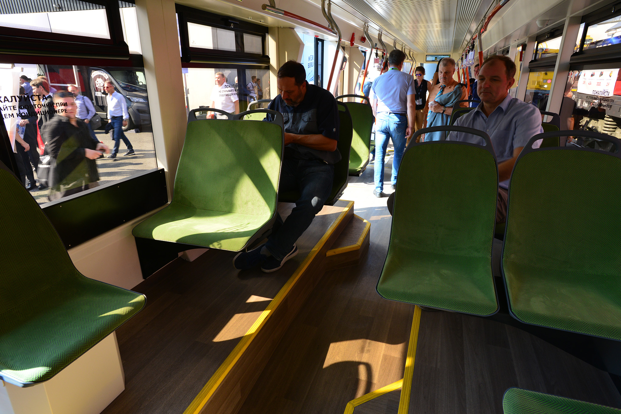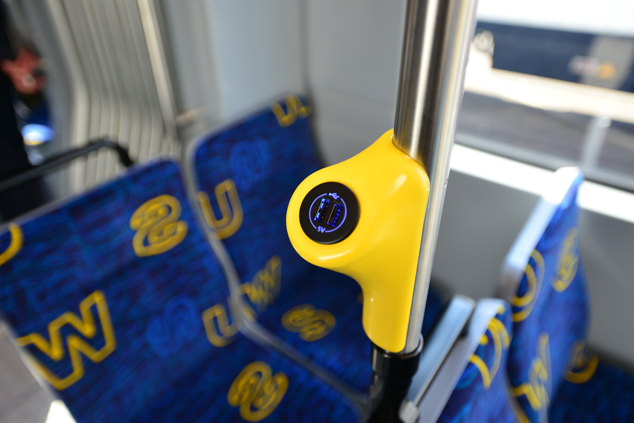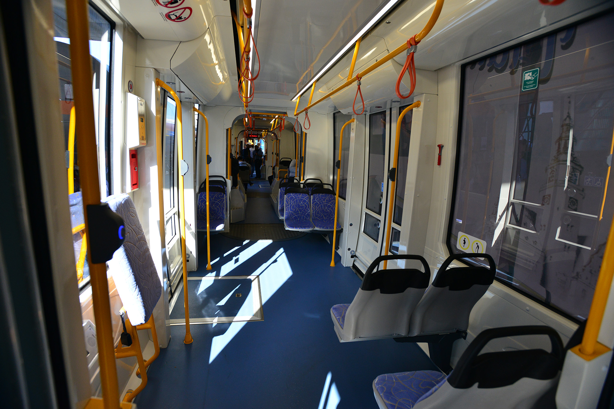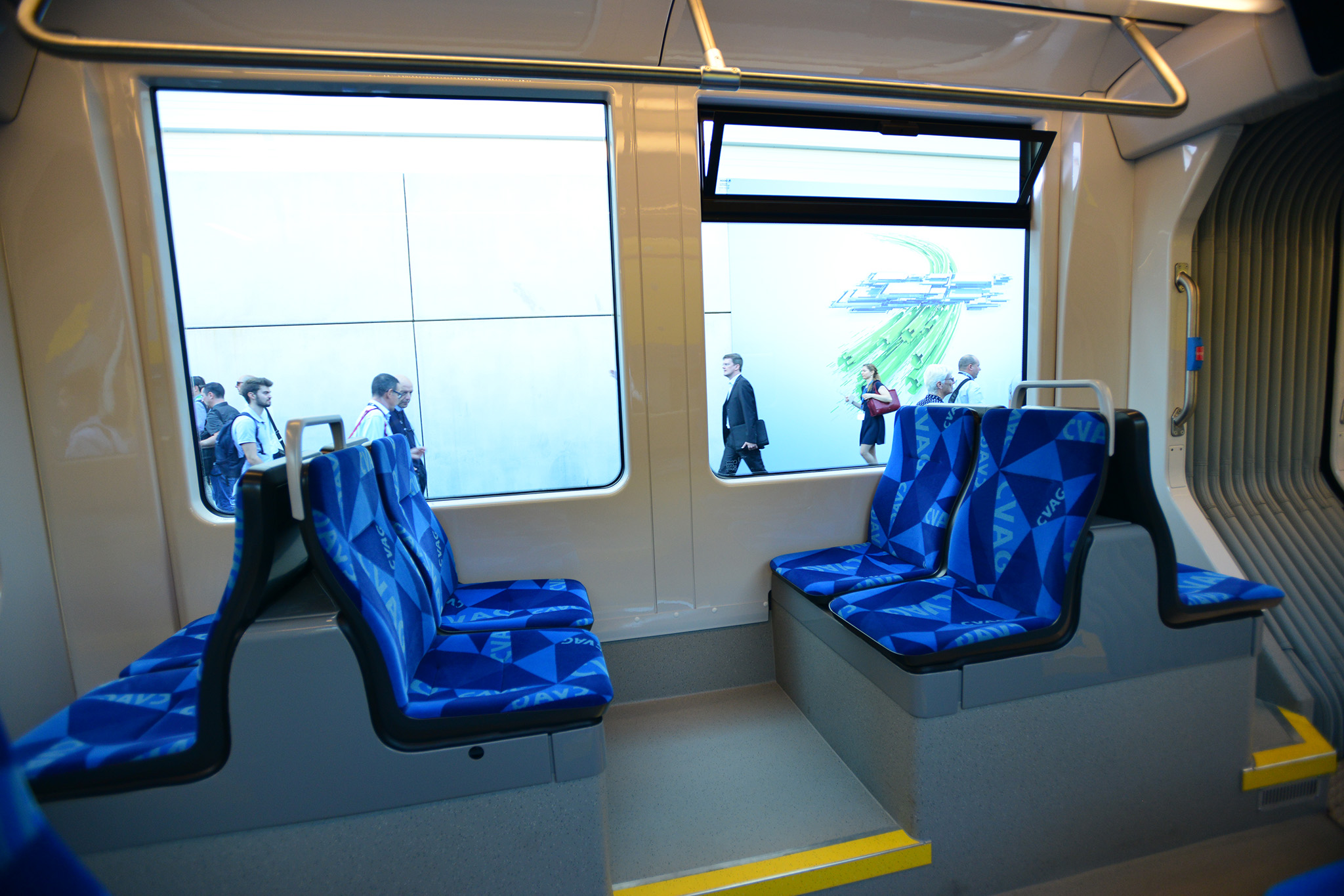 客艙加大窗戶讓車廂更加透光,內裝採黃、白、靛藍色系,讓人感覺沉穩又略微亮麗。座椅放置均向著門口方向兩兩並排,