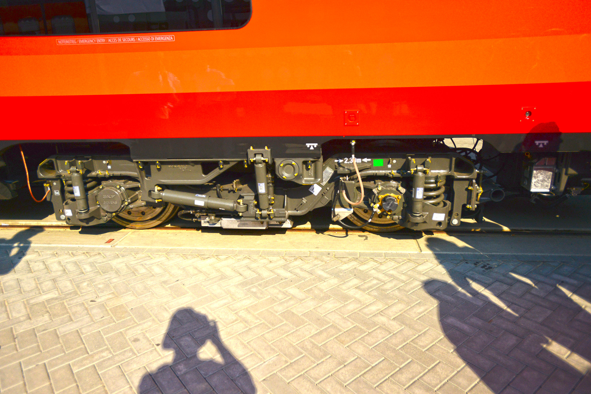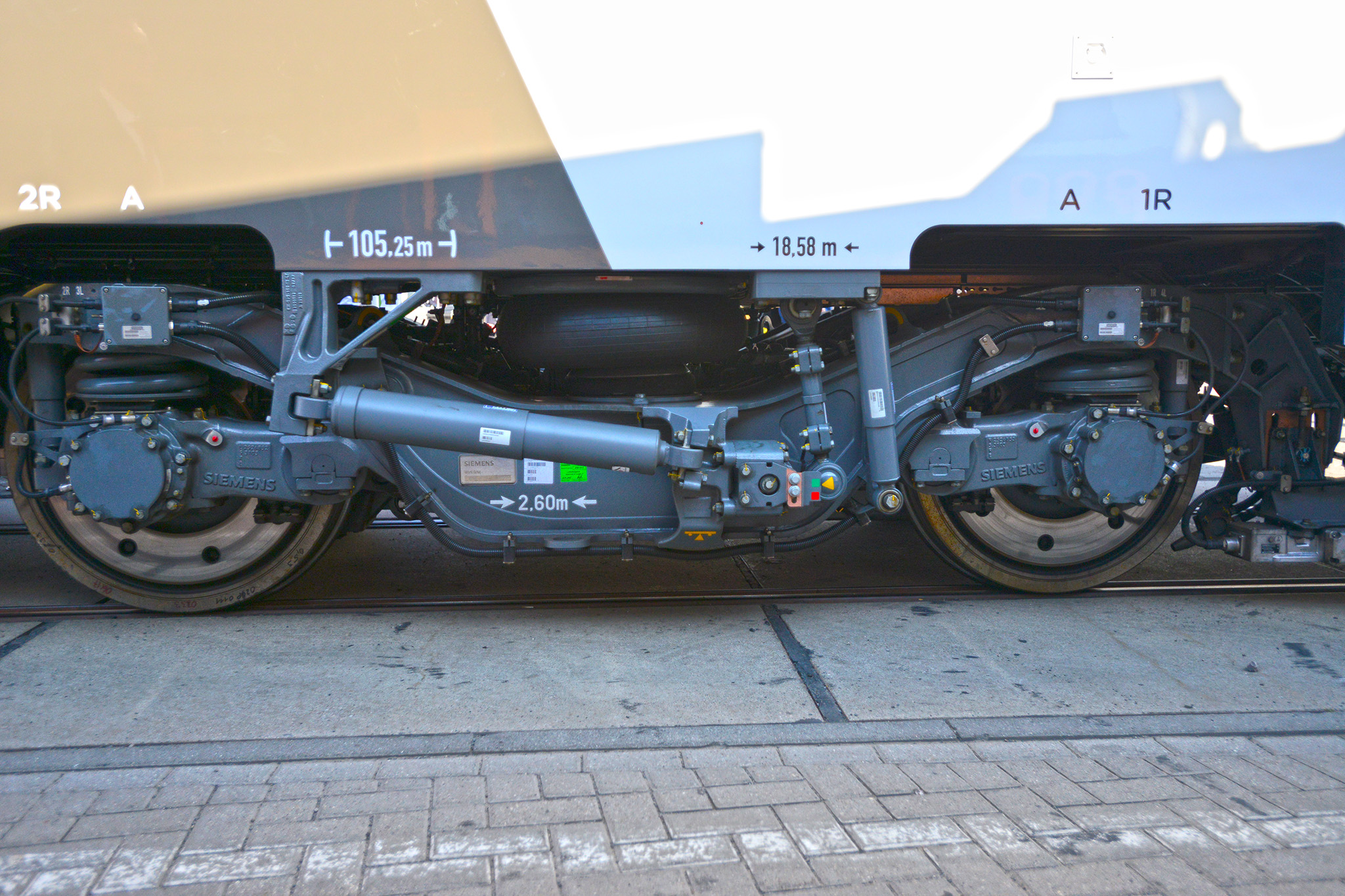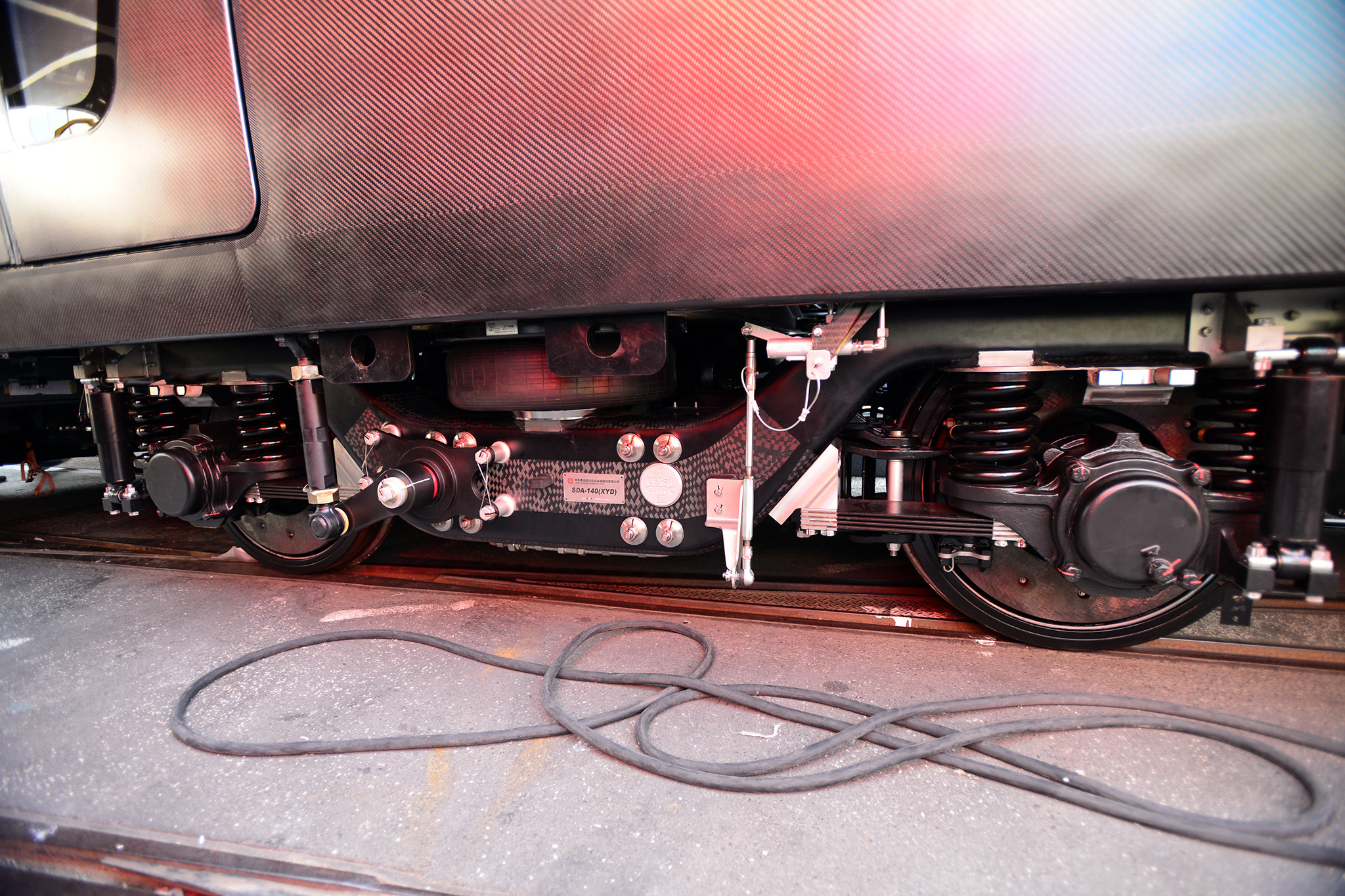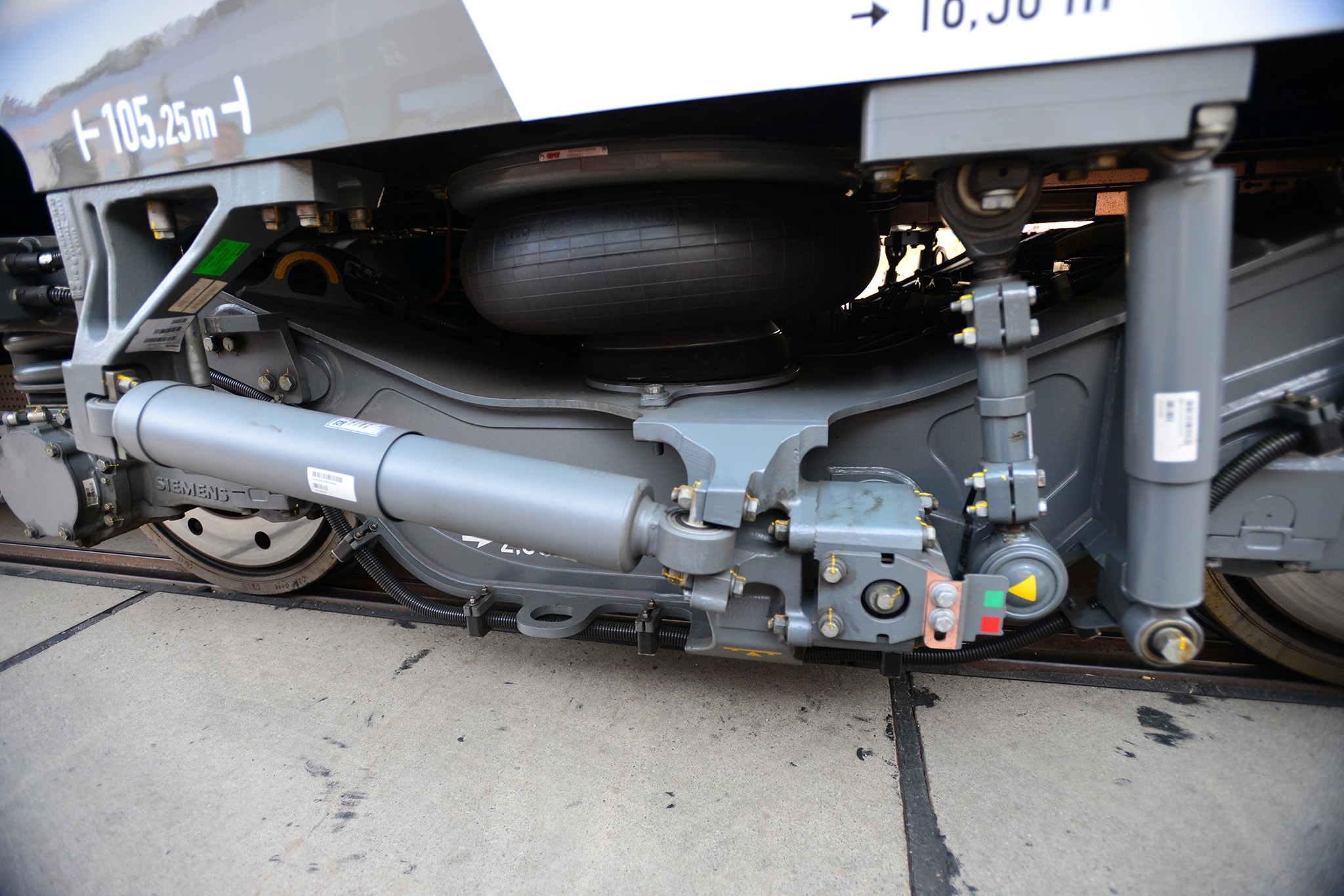 該車輛的轉向架結構,似乎在車體與轉向架間又多一根垂直阻尼,可能是為了減少空氣彈簧的搖擺吧!